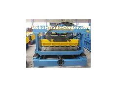 Roof tile forming machine includes in decoiler, sheet guiding equipment, covering film device, roll forming system, pressing device, post-cutting equipment, hydraulic station, electric controlling system and run out table for product.